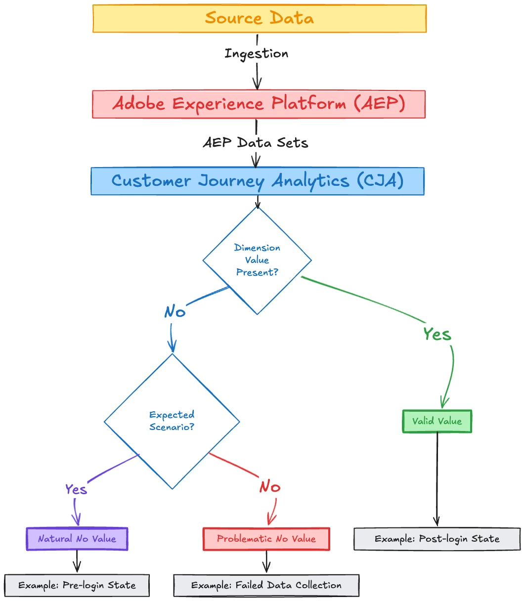 Remember: The goal isn't to eliminate all "No Value" instances from your CJA implementation, but rather to establish and maintain CJA organizational data heuristics and administrative oversight that clearly distinguish between expected and problematic "No Value" scenarios. These guidelines should be grounded in your understanding of user journeys, system limitations, and valid business cases where "No Value" dimension values are expected and reasonable. By developing and documenting these data interpretation rules, you create a robust framework for evaluating when "No Value" cases require intervention versus when they represent valid data states.