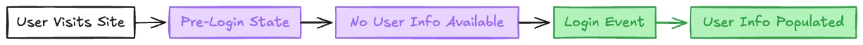The diagram shows how user data flows naturally through CJA. It starts with a pre-login state (represented in purple) where "No Value" entries are expected and normal because user identification hasn't occurred yet. When users authenticate and log in, the state transitions to post-login (shown in green) where user information is properly populated with meaningful values in the CJA. This progression from unidentified to identified states is one of the most common scenarios in data collection. It shows how "No Value" entries can effectively indicate where users are in their authentication journey. This pattern is both expected and useful for analyzing user behavior and system functionality.