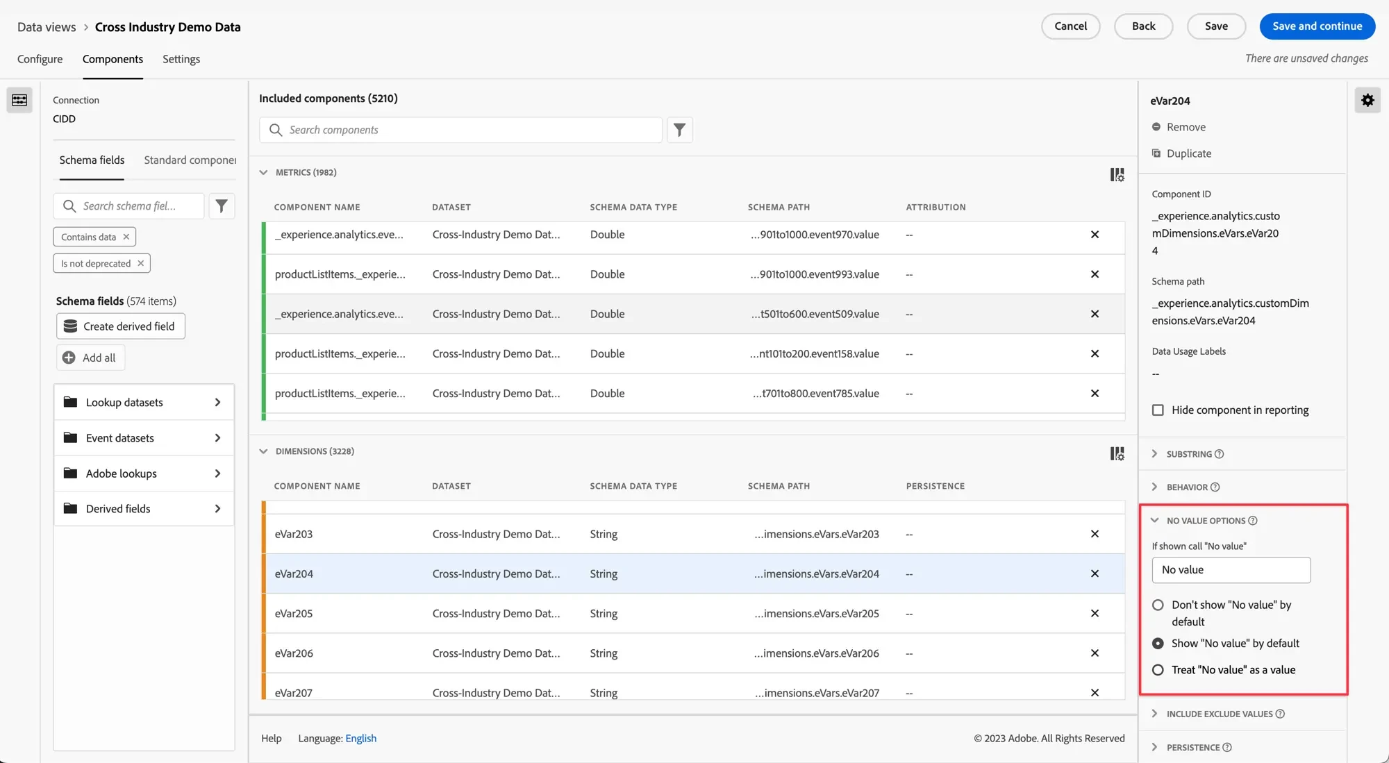 Customer Journey Analytics provides an extensive set of configuration options that have been engineered and optimized for managing and controlling how "No Value" entries are handled within your Data View dimension settings. These settings can be configured by CJA product administrators at the Data View level, giving precise control over how "No Value" entries are processed, interpreted, and displayed in your CJA implementation. This configuration framework enables you to fine-tune the handling of "No Value" according to your specific needs, ultimately ensuring your reporting output aligns with your organization's analytical requirements, data governance standards, and broader business objectives: