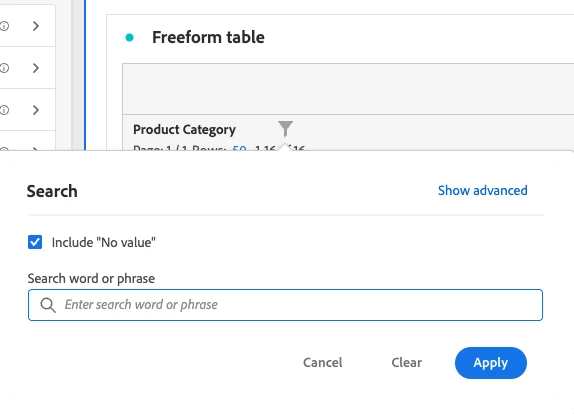 This setting controls whether "No Value" appears by default in reports. When enabled, "No Value" entries will be visible, though users can exclude them using the checkbox in the freeform table search filter. Including or excluding "No Value" rows affects percentage distributions, as percentages are calculated based only on visible items.