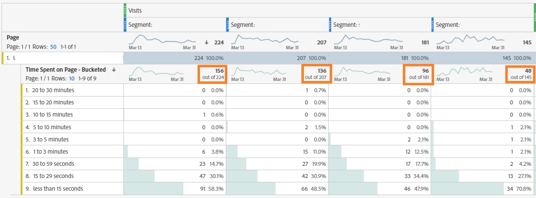 For the segment in the first column, there were 224 visits in total on that page. In the numbers in the orange square, there seems to be a total of 156 (out of 224 visits).