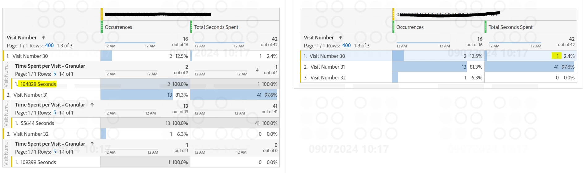 Any idea why a particular visit identified by adobe ID is falling under the time spent per visit bucket for more than 15 hours when the total time spent is only 66s.