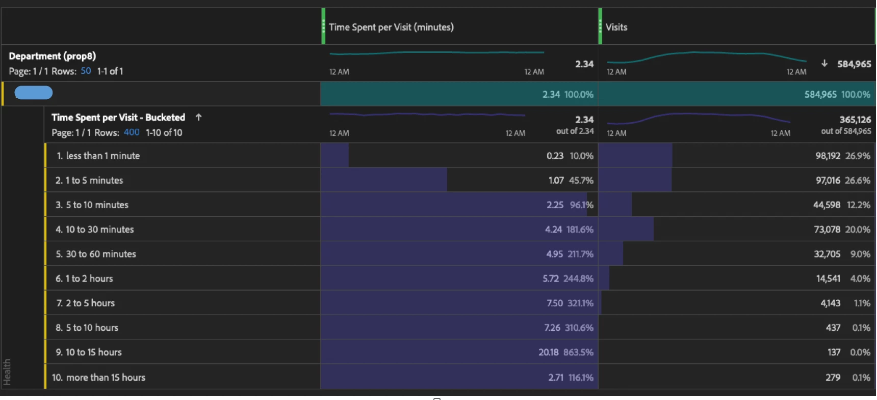 2.34 is the average time spent for this prop value, by 584,965 visits.