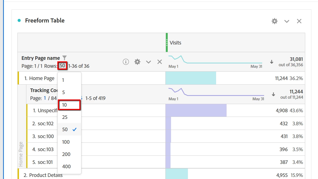 You can select the number of displayed line items by choosing it from the free form table as shown below.