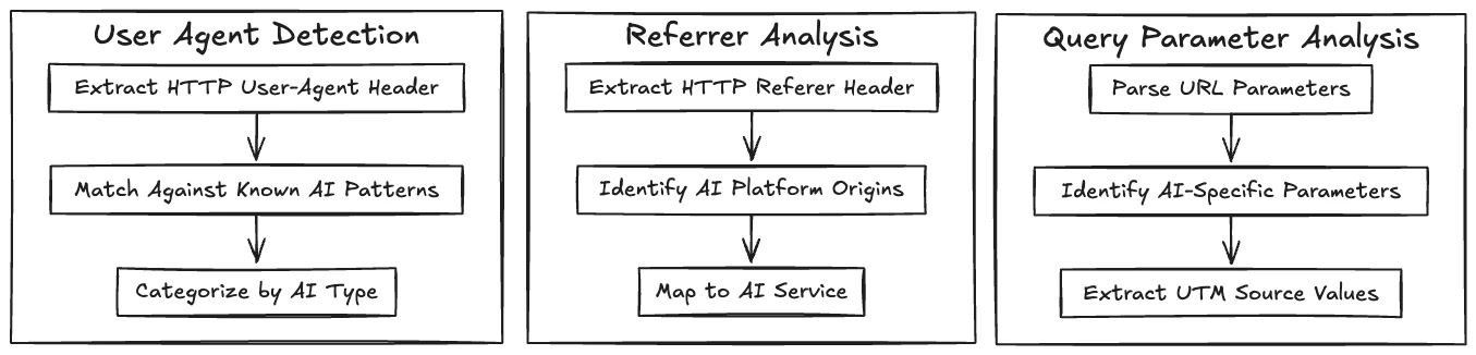 - User Agent Detection: When a request is made to your server, the HTTP User-Agent header is extracted and analyzed against known AI crawler and agent patterns. This server-side method requires access to HTTP headers and is most effective when implemented at the data collection layer.