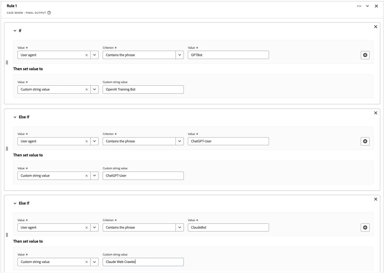 NOTE: The effectiveness of these LLM and AI traffic detection methods will evolve as AI technology advances. Organizations should regularly update their Customer Journey Analytics derived field logic to capture new AI user agents, referrer patterns, and query parameters. Today's effective methods may become outdated as AI services modify their identifiers or new providers emerge. We recommend implementing a quarterly review process to validate and refresh your detection criteria, ensuring your analytics data stays accurate and reliable as AI interactions with your digital properties continue to evolve.