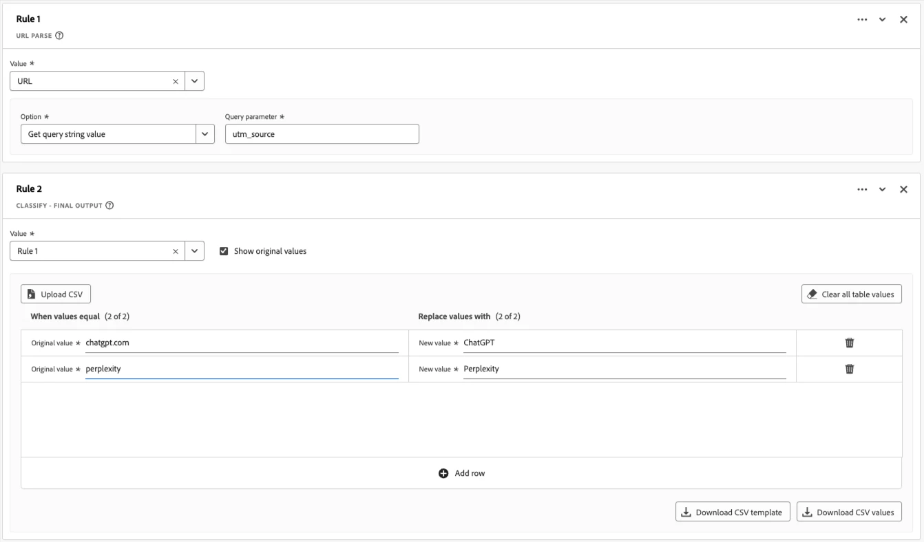 - LLM/AI UTM Parameter Detection: Create a derived field to identify and classify traffic based on AI-specific UTM parameters: