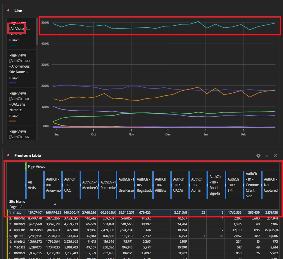 Now I have the table set to calculated percentages by row not column, Why is the "all visits" line trending at 50% it should be ALL VISITS 100% right?