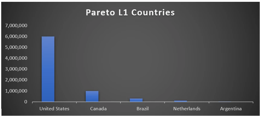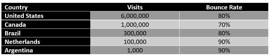 To know which country to prioritise, you export the website traffic and visualize. With this chart, it will be clear to your stakeholders that United States is the priority. It doesn’t mean you ignore Canada and other countries, but the one million can wait versus the six million visits.