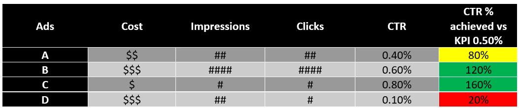 - Above shows that Ad D had the worst performance compared to your CTR KPI of 0.50%.