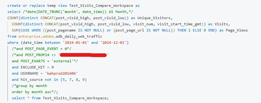 I'm trying to tie out UVs, Visits, and Page Views from Adobe Workspace to Downstream Databricks from the adobe daily web traffic table. Here is my code. I don't know why it's not lining up and I cannot seem to find a good answer. I used the documentation to have certain filters. My page views by month start to fly off, along with visits. UVs seem to be fine though. Can anybody help with this? If not, can someone point me to a Downstream analytics consultant?