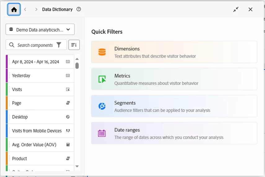 There are two different views of the Data Dictionary – what admins see and what general users see. I’ll start with general users. When you open the Data Dictionary, you’ll see a list of your components, the standard search bar, and your report suites on the left, and on the right you will see some quick filters.