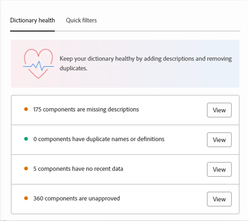 For admins, you get all of the above features, but you also have access to the Data Dictionary Health. This will give you a snapshot view of the completion level of the Dictionary. Adobe has some great documentation about keeping your Data Dictionary healthy. This view has the option to view all components with each type of issue, making it easy to find the ones that need to be updated.