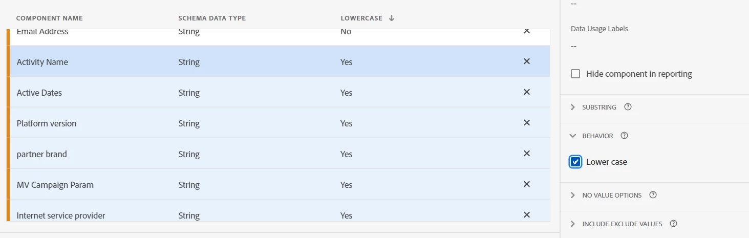 When managing components, many settings can be managed for multiple components all at once. For example, a general best practice is using lowercase for dimension values. When lowercase is enabled, values such as Homepage and homepage will be reported together. Without this setting, each version of capitalization will be reported on a unique row.