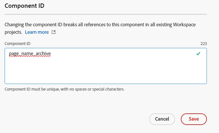 Clicking this icon will allow you to change your Component Name. Add “_archive” to the end and save the new ID. You’ll now also need to save your changes to the data view.