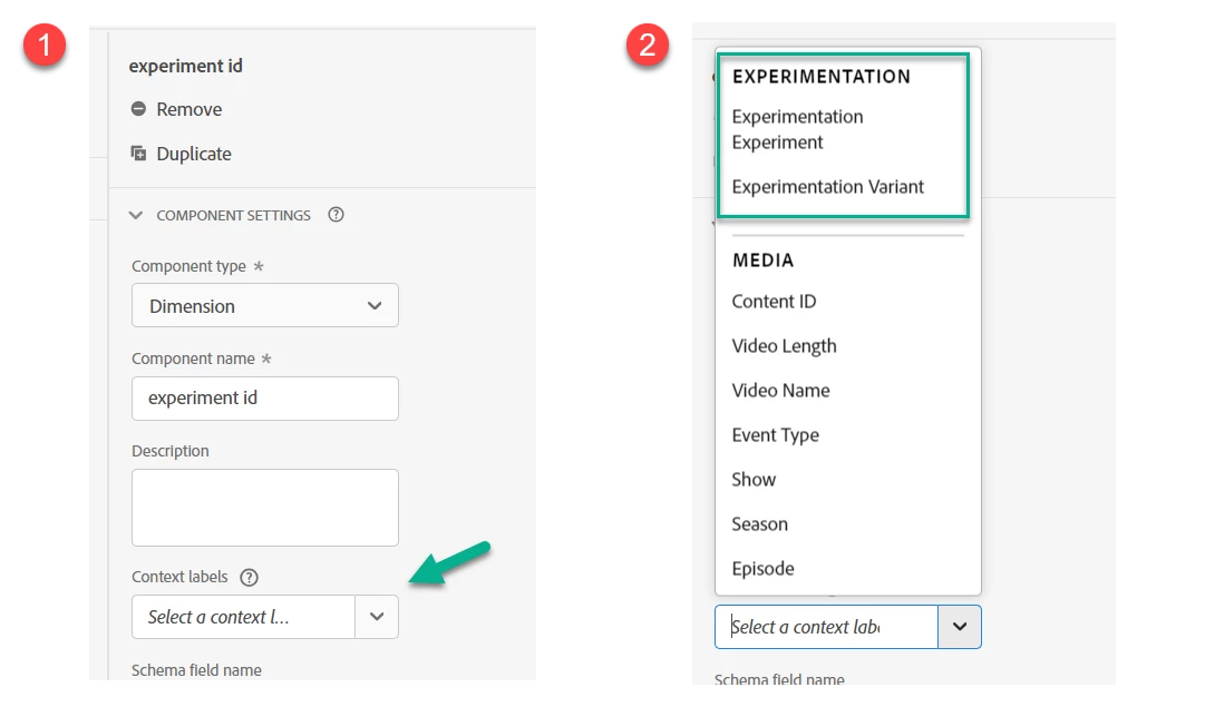 Within the appropriate dimension, open the context labels dropdown (1). This will allow you to select either experiment or variant (2). Once these dimensions have been identified, you’ll no longer see these as options in the dropdown. If you later need to change the selections, you’ll need to remove the context label from the existing dimension first.
