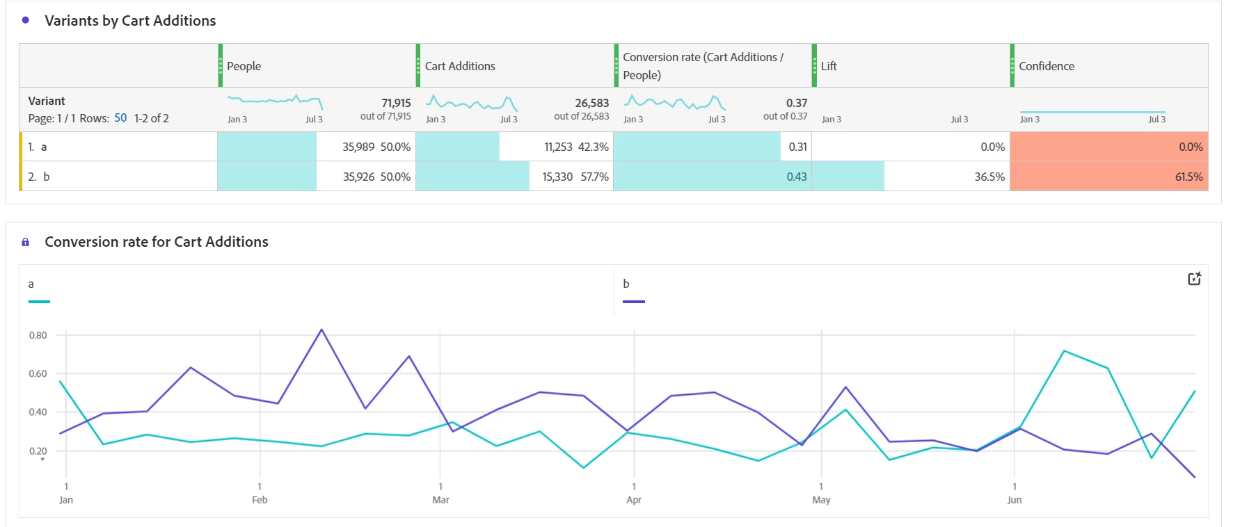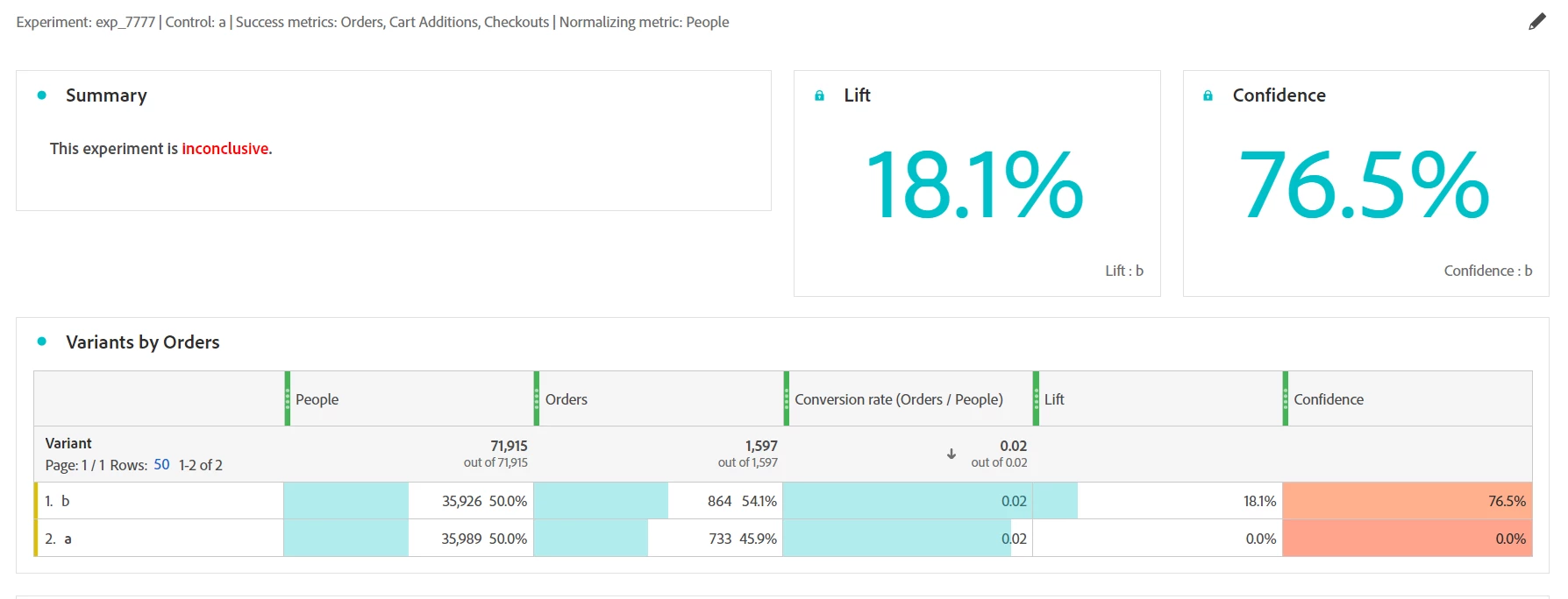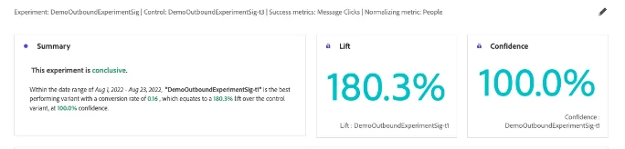 Freeform tables and trending charts show the performance for each success metric. Hovering above lift and confidence metrics in the table show the calculation and provided description.
