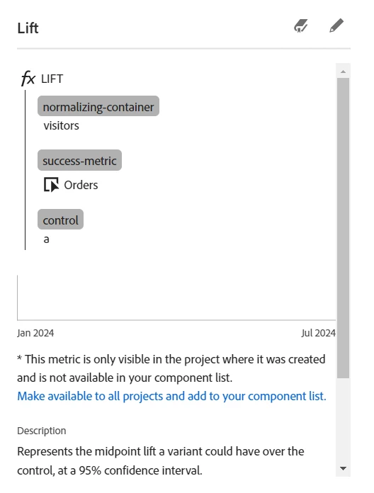 The lift and confidence for the first selected success metric are featured. Hovering above the lift and confidence metrics in the freeform table, we can view the calculation and the provided description.