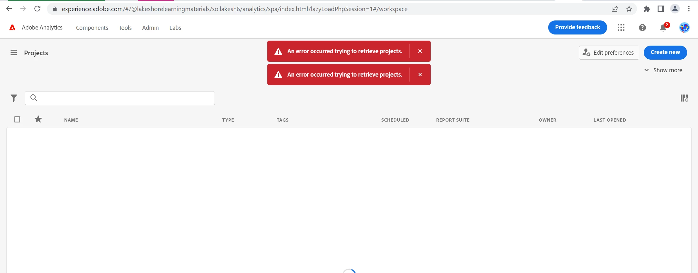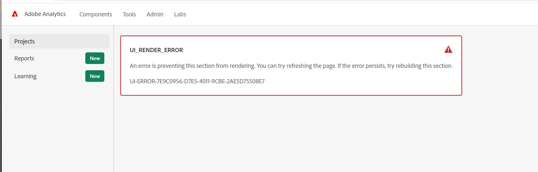 I've been unable to use Analytics at all this morning, because whenever I try navigating to Workspace or Reports, the following error shows up after a solid minute or two of loading: