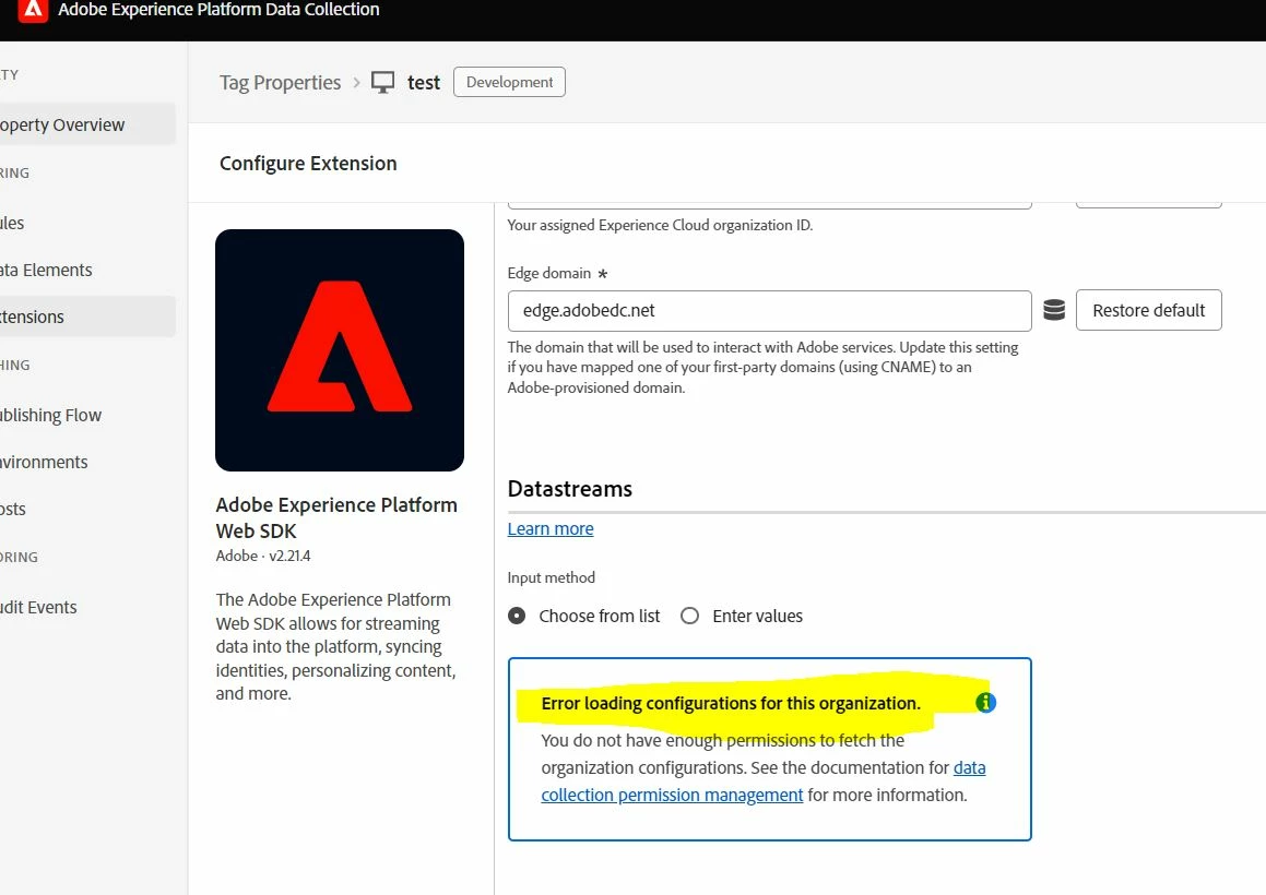 The part you have highlighted mentions that you don't have enough permissions. Have a look at this link: https://experienceleague.adobe.com/en/docs/experience-platform/collection/permissions or the one from the above screenshot and check if your user has the required access for configuring the SDK extension.