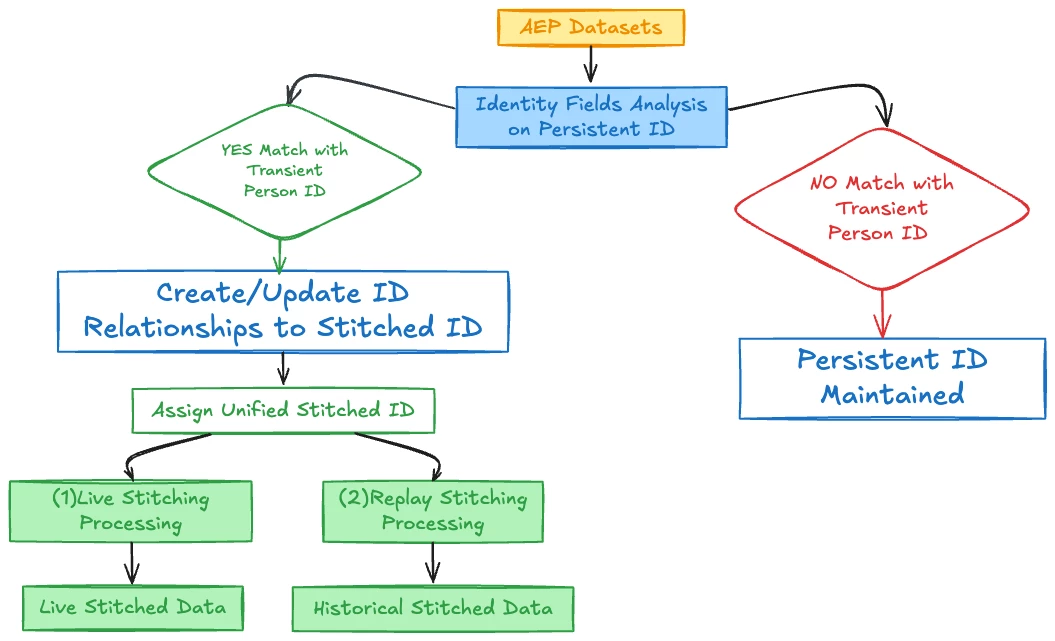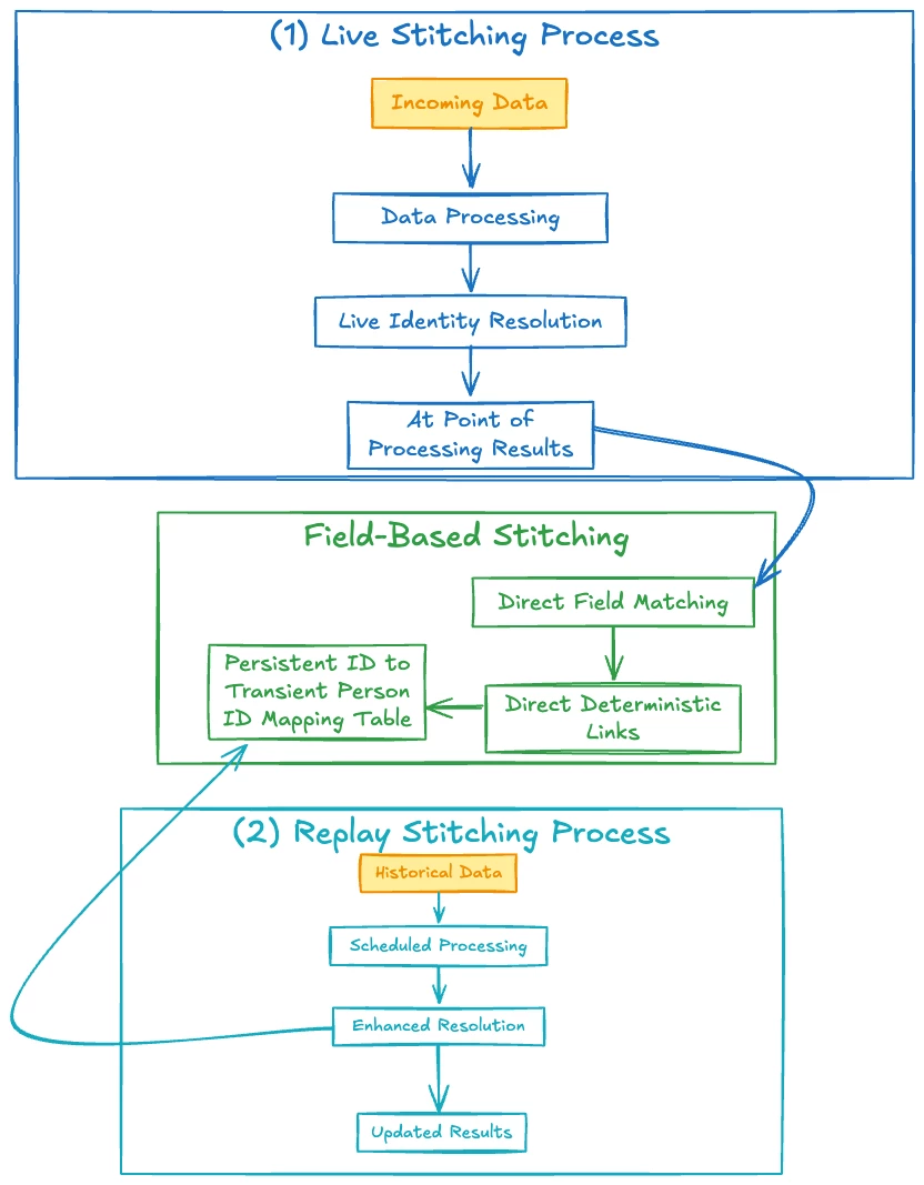 - Replay Stitching: A scheduled process that retroactively updates Stitched IDs for events where later data revealed an association with a Transient Person ID. Replay uses only the stitched dataset for restitching data; it does not need to interact with the the original source data.