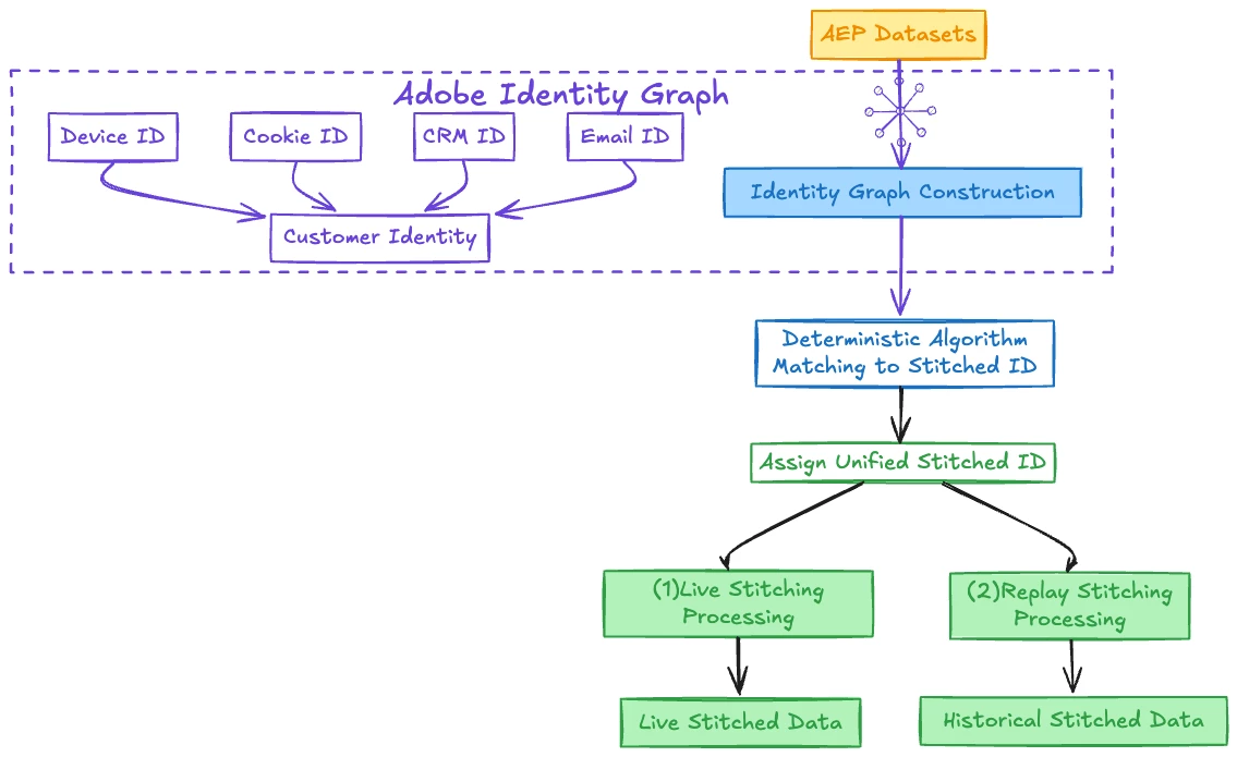 | Source of Identities | Direct field matching within a single dataset | Adobe Unified Identity Service |