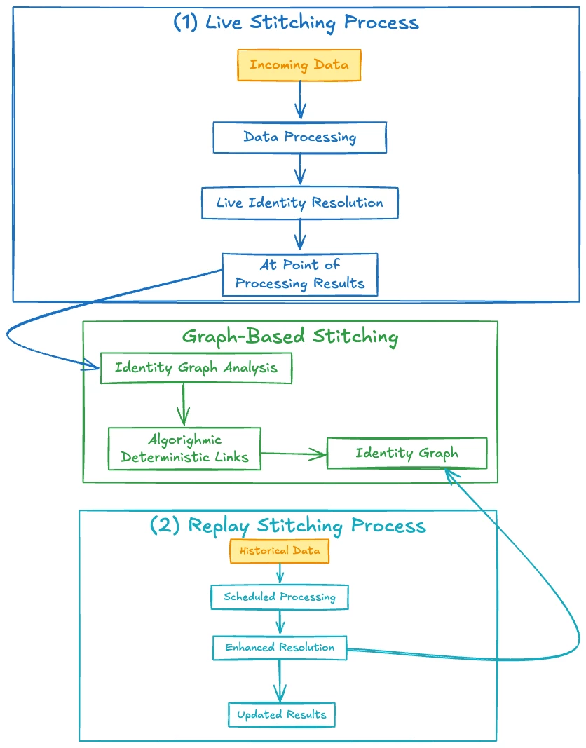 - Replay thus ensures that all events benefit from the latest identity graph knowledge, allowing device-based activity to be merged under the correct person as identities are learned.