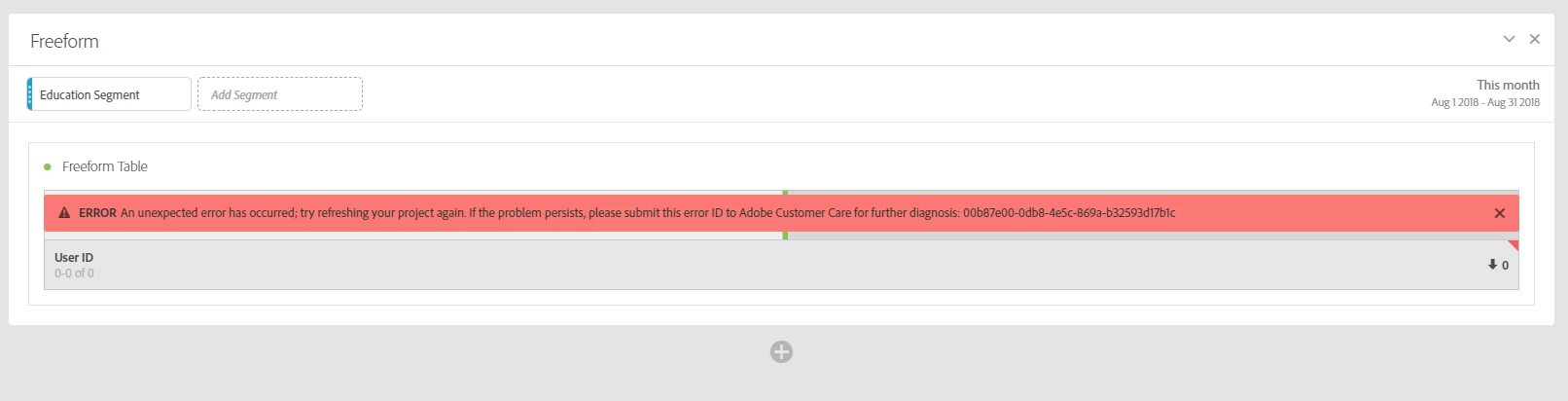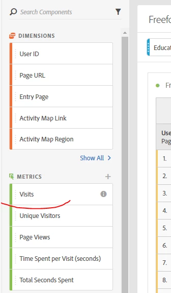 When I try to add 'Visits' (screenshot 2) as a metric or skip through the pages i.e. from page 1 to 2 or page 4 to 5, I get an error message in red, see screenshot 3.