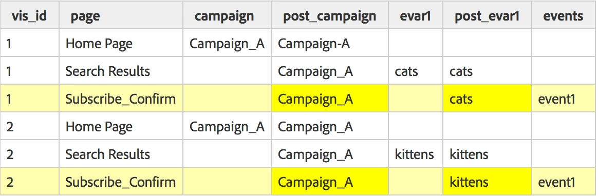 - Organize the values based on the order of subrelation. If a variable does not have a persisted value (such as if an eVar was never defined or expired), it will be bucketed under ‘None’.