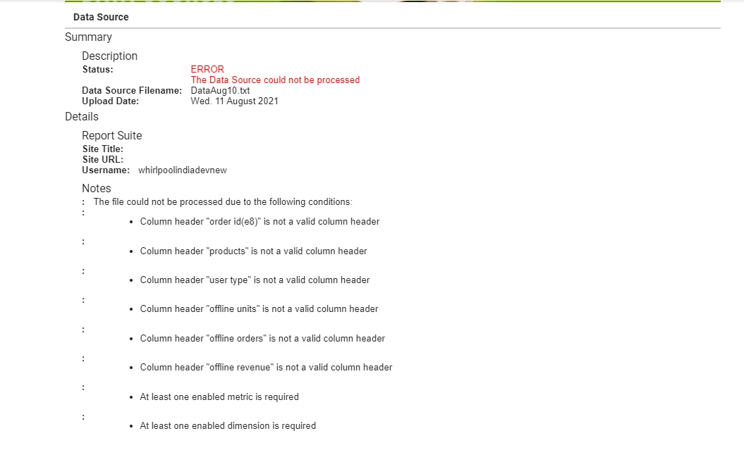 I am implementing flat file approach to upload offline data, created generic summary DS, uploaded in FTP. But getting below error: