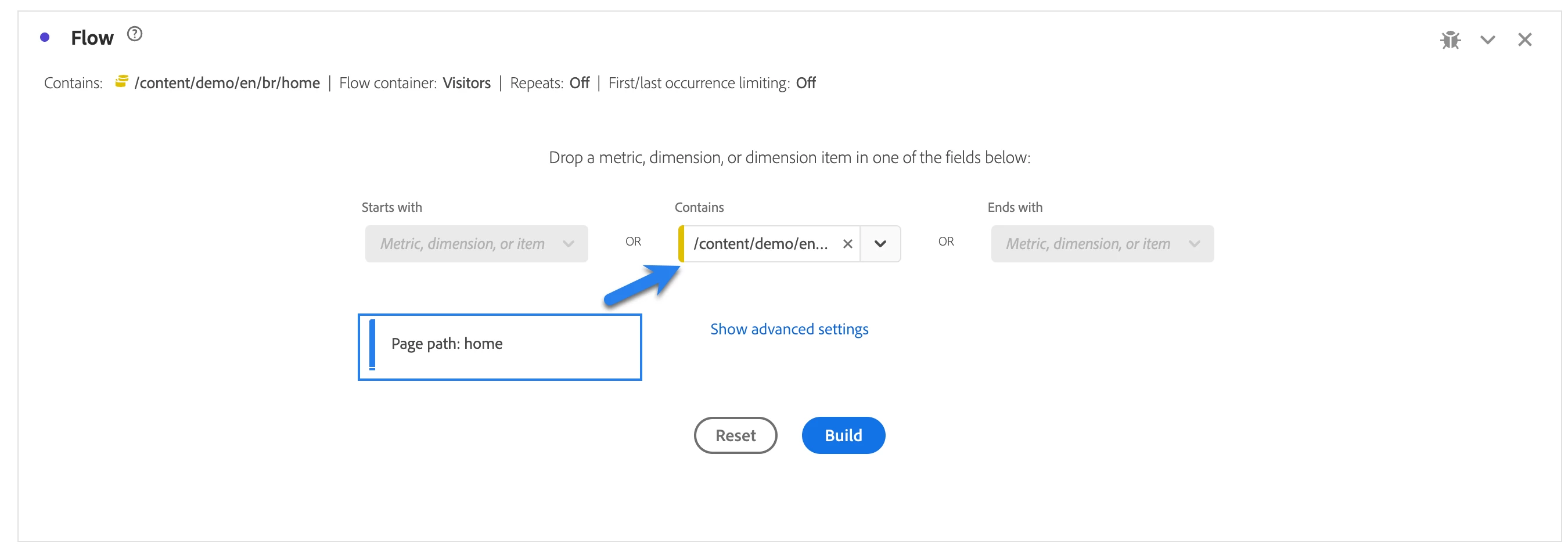 Currently, you can only use dimension items in the flow display. This limits visibility into pathing in and out of a "group" (example: if you had a URL dimension, you may want to see pathing into all URL's that contain /products/ instead of just /products/widget-a/ )