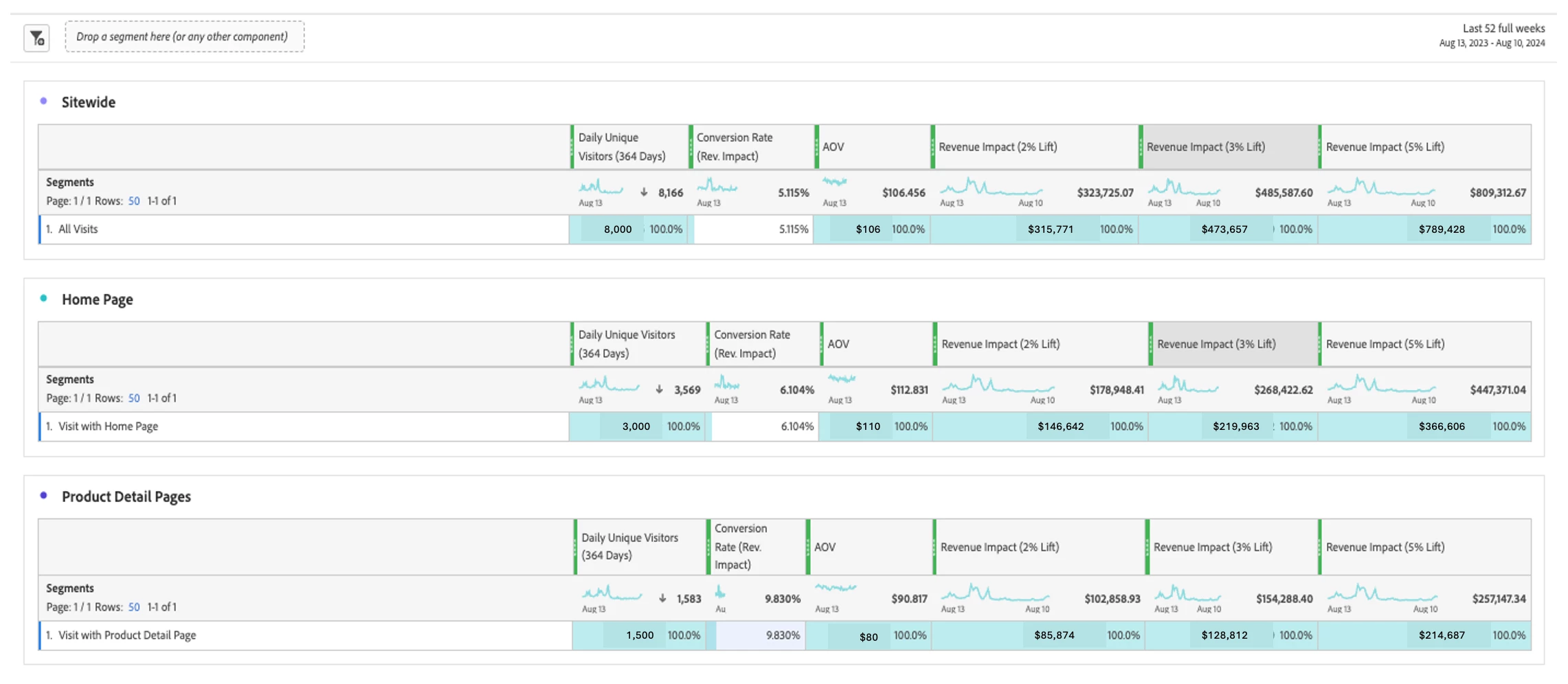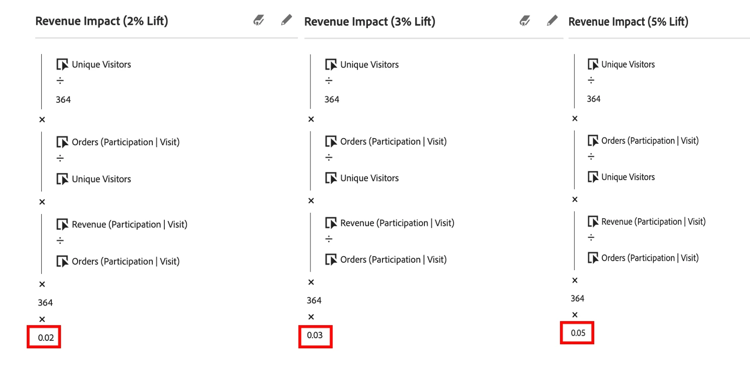 Shown below are the calculated metrics for Revenue Impact, using 2%, 3%, and 5% lifts.