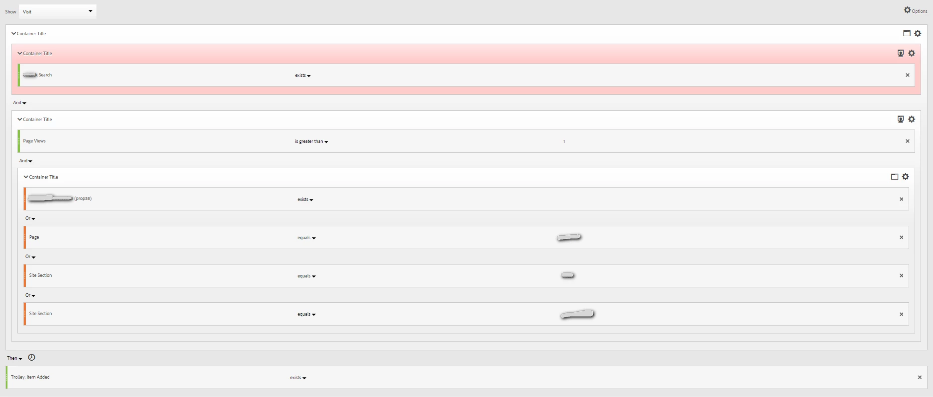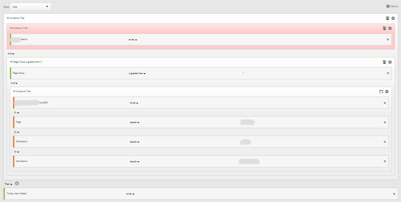 Hopefully this makes sense, the screenshots are from Adobe Analytics segment manager, the second segment with the 'Then' operator does not return any data. When viewing the segments in Ad Hoc Analysis an error appears saying 'Containers in sequence must be lower context than parent container' which I get, but why does it only show this error when the 'then' operator is added and not the original segment?