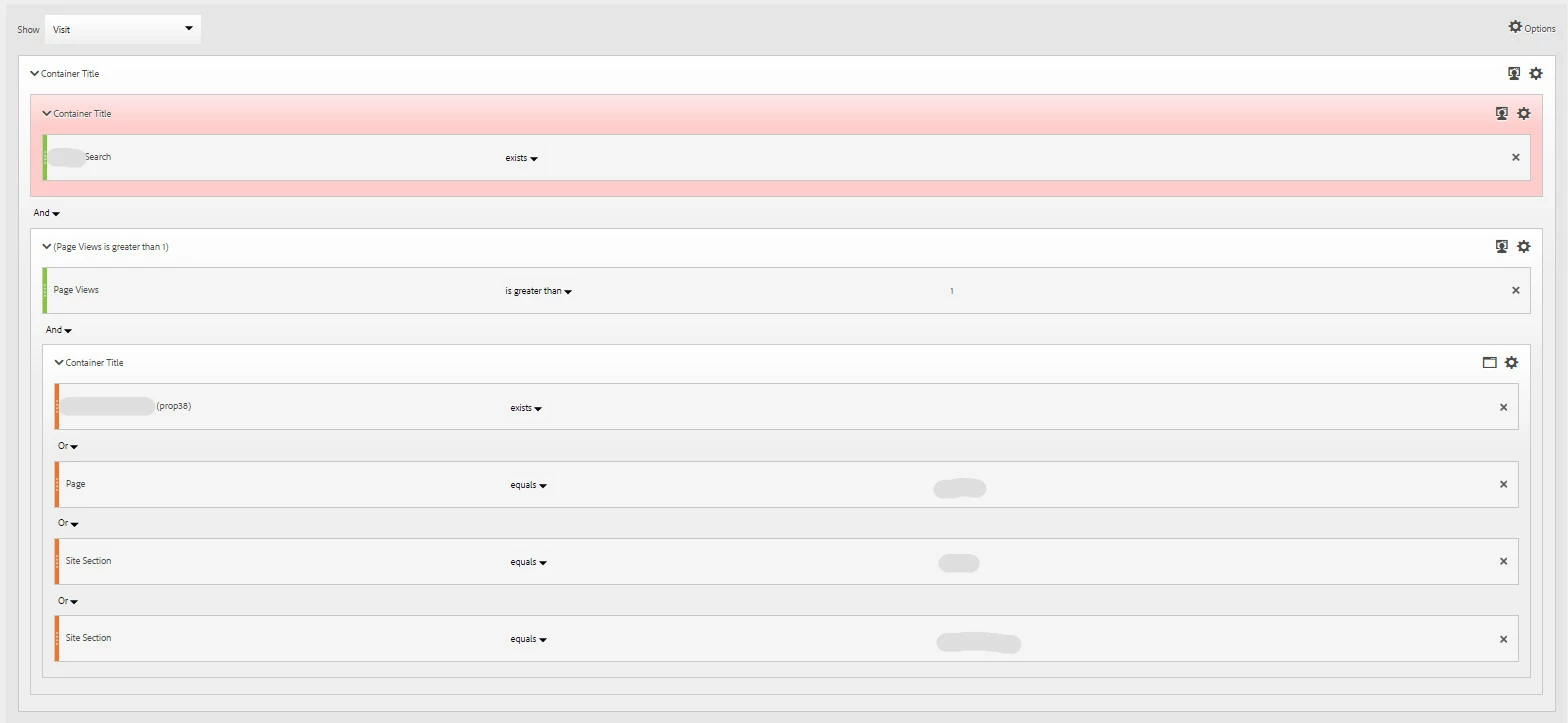 I need to have a visit container in the visit segment as my conditions 'Page views is greater than 1' and 'Onsite search does not exist' are at a visit level.
