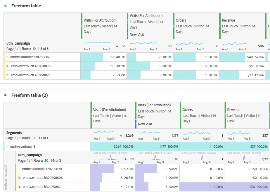 However, when I create a visit segment for that same criteria, it doesn't include all of the activity. Note that "emhvasmtouch320250806" returns 10 fewer visits and is missing a $49 order.