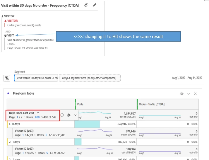 case1 is that I want to see "day since last visit (how many days past between current visit and last visit)" amongst hit traffic having conditions below