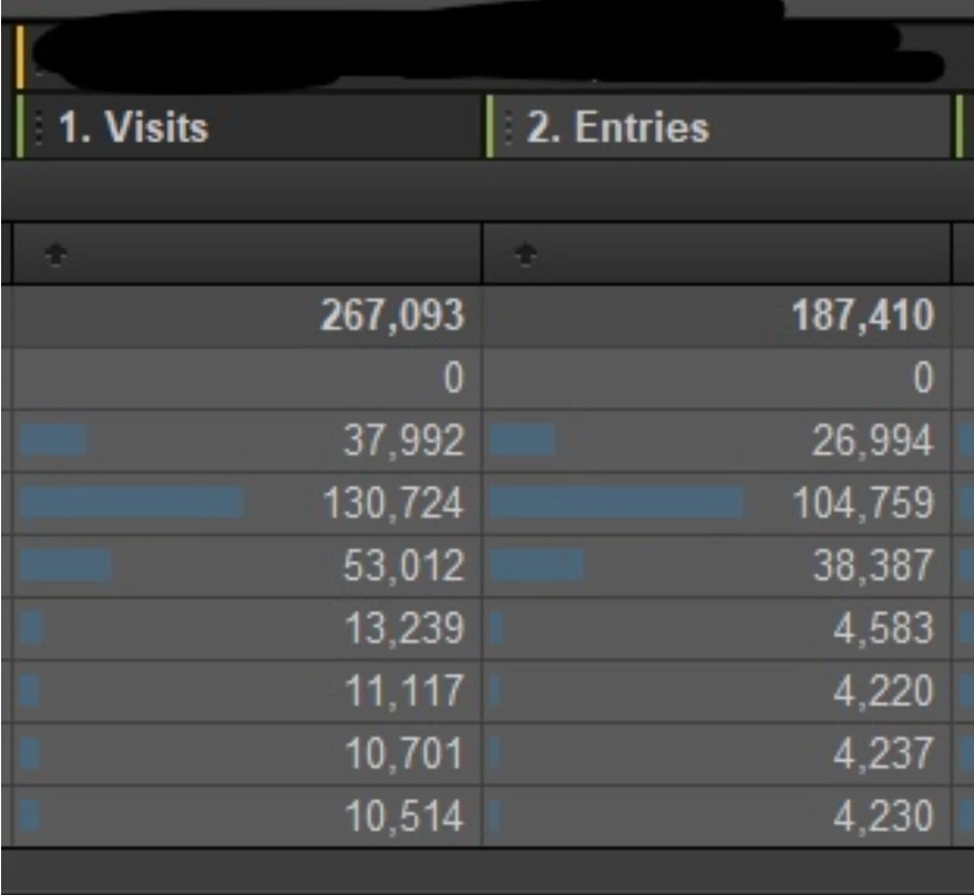 We then tried to measure Visits and Entries for just one of the pagenames and the number of Visits and Entries were different. Then we applied a segment with just that pagename and it also showed the same result as before - Visits and Entries were nearly the same.