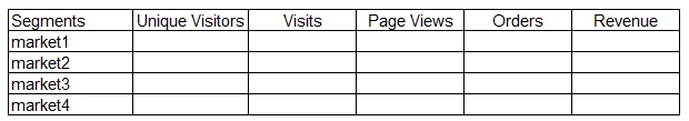 I know how to create an individual segment to capture all of this for France. But we also have 19 other "market" combinations to track. If I want to display a table in Analytics Workspace with the "market" as the 1st column, I would have to individually build all 20 segments, and then manually stack them into the panel. (sample image attached) Is there any way to build a dynamic segment using the logical operators in calculated metrics that could be a workaround for this?