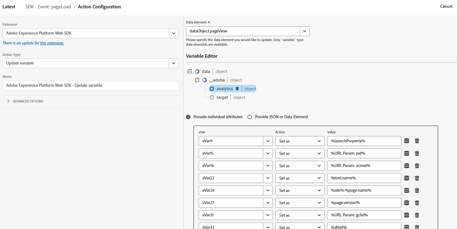 If I look at the dataObject data element, it is also empty, which leads me to believe the Update Variable action in my Launch rule is not working