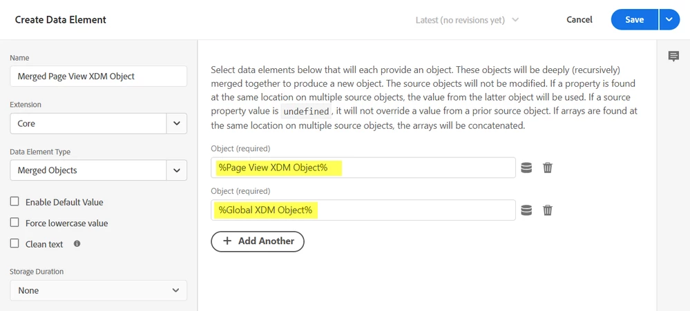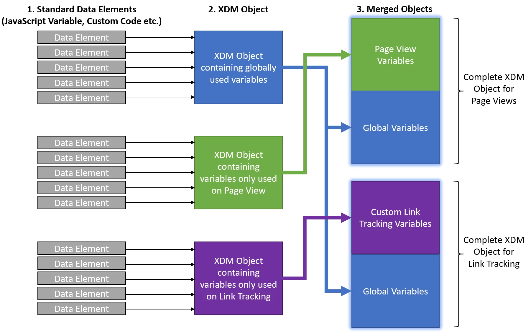 By arranging things this way, you are avoiding duplicating areas of your XDM Object, which makes it easier to maintain. For example, if you want to add a new variable to be sent on both page views and link tracking, you simply add this to the global XDM object Data Element, rather than having to do this in multiple places.