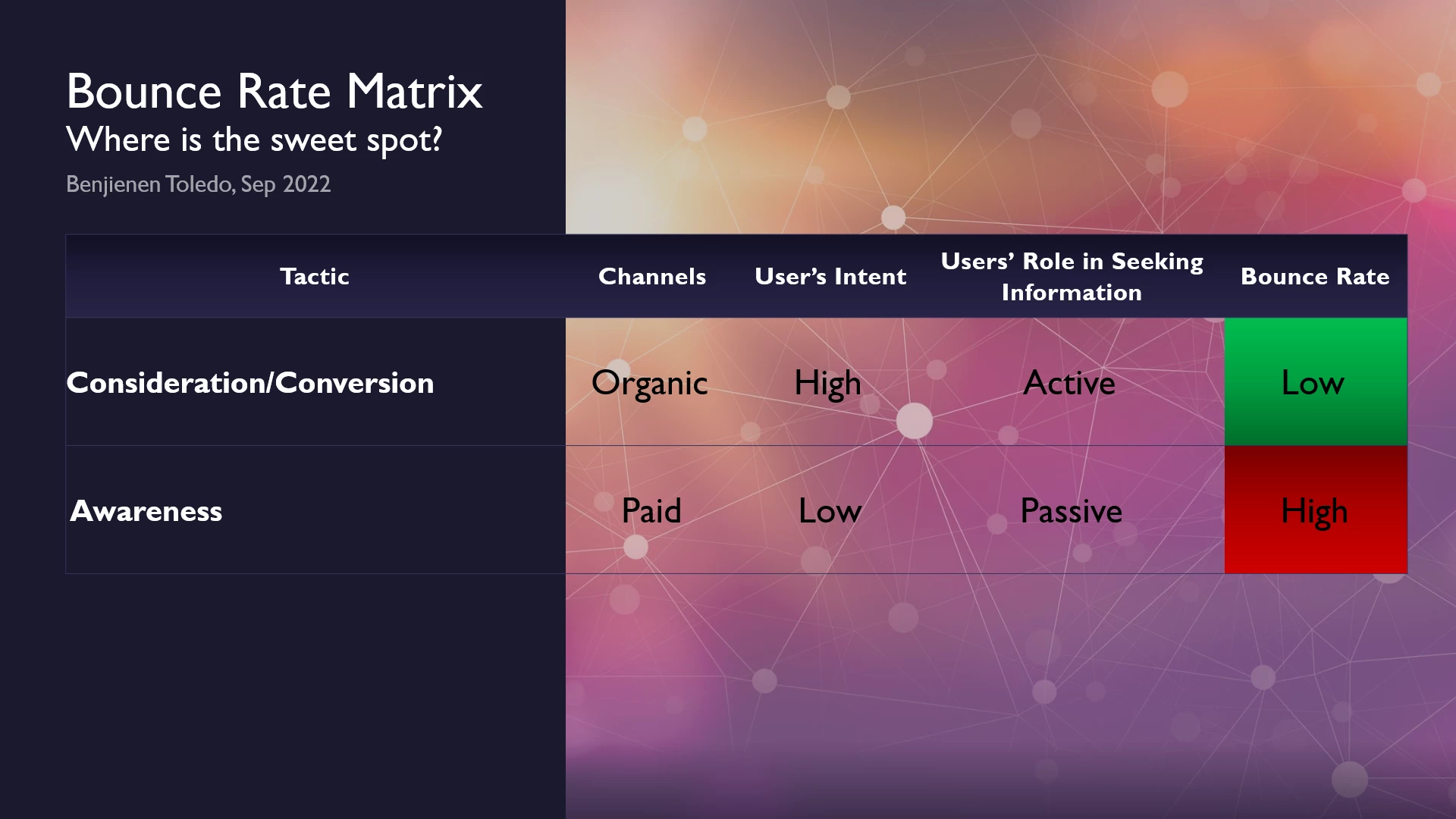 Bounce rate shifts as your campaign moves in stages and channels, together with the intent and role of users in seeking information. The more intentional your user is in their search towards the latter stage of their customer-decision making journey, the lower the bounce rate.