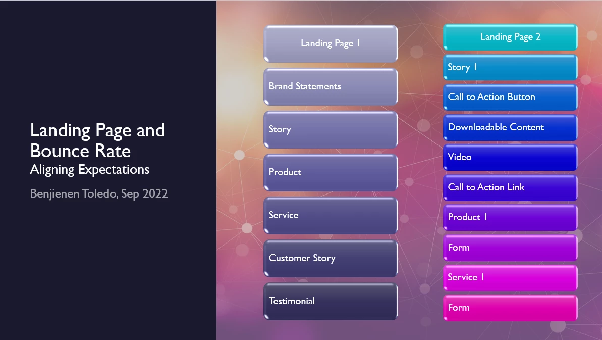 For example, between landing page 1 and landing page 2, the latter offers more variety of content format for the users to act on, hence, lower bounce rate. While we can predict that the first one will have higher bounce rate with lesser opportunities for the users to engage.