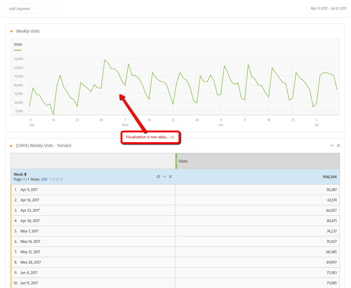To do so, I created a simple free-form table with the "Week" dimension and then chosen whatever metric I'm interested in (e.g., Visits, Conversion, etc.). From there, I create the visualization (right-click in the data table and choose Visualize). This previously gave me a visualization that aligned to whatever time-based aggregation I chose, but not anymore. If I wanted a daily grain in the visualization, I'd use the "Day" dimension in the data table.... Did something change in Workspace or have I simply lost my mind?