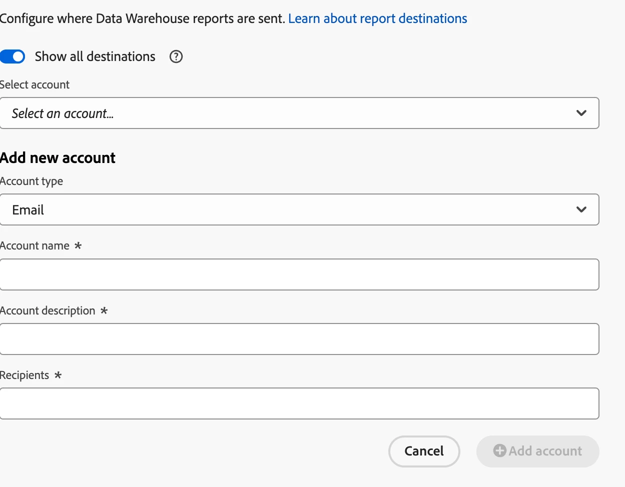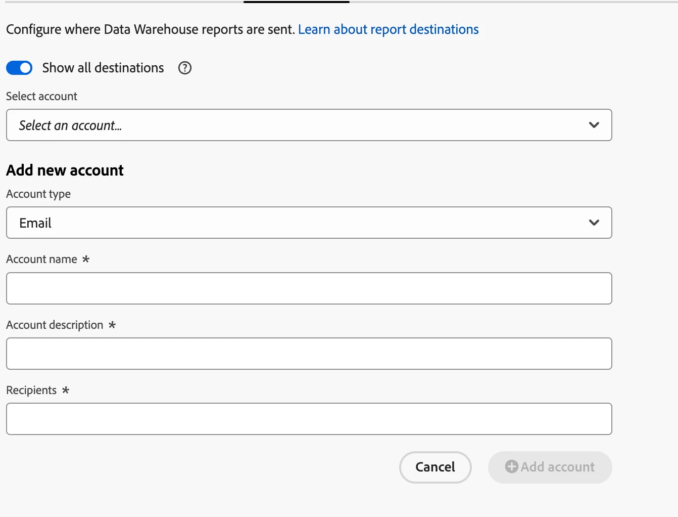 I am trying to create multiple email destinations under a Data Wearhouse report but I am not sure where to put the email address.
