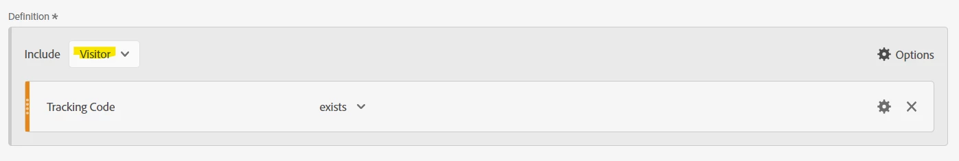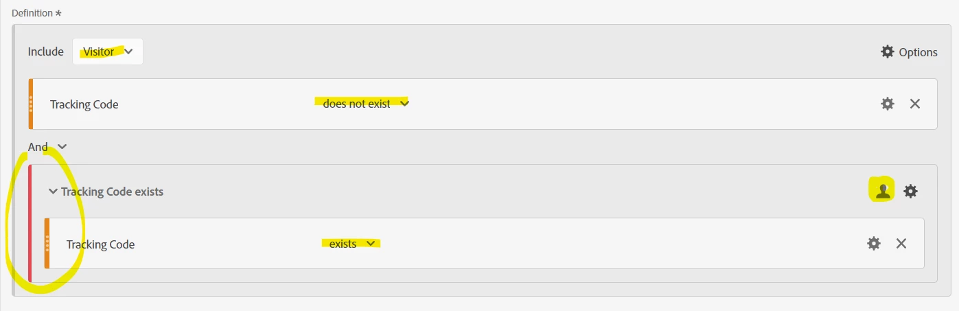 (Notice the inclusion of an exclude container, also at Visitor level, excluding visitors that have tracking code.)