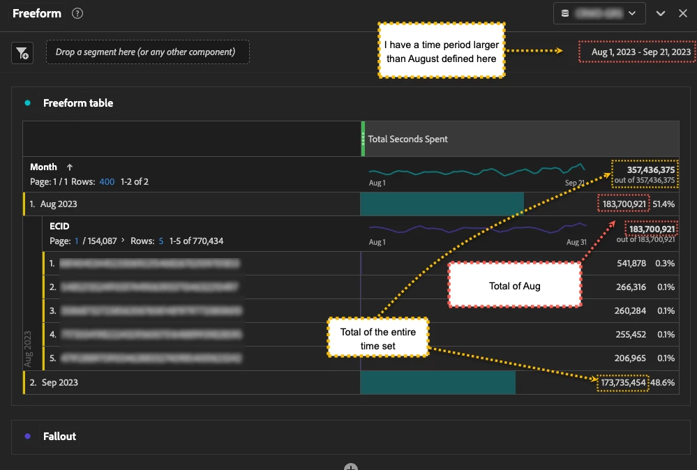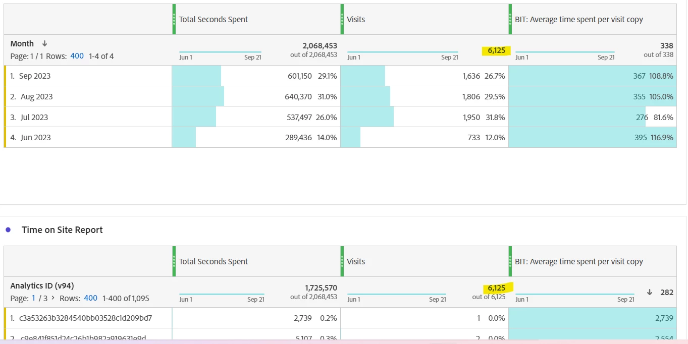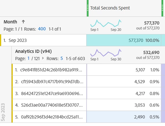 By using total seconds spent metrics data is showing different for month wise report and Analytics ID report.