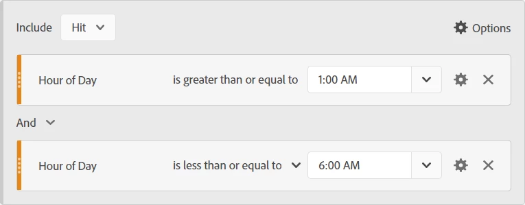 1) Create a 'hit' level segment called 'non-core hours' where 'hour of day' is greater than or equal to '1:00am' AND 'hour of day' is less than or equal to '6:00am'