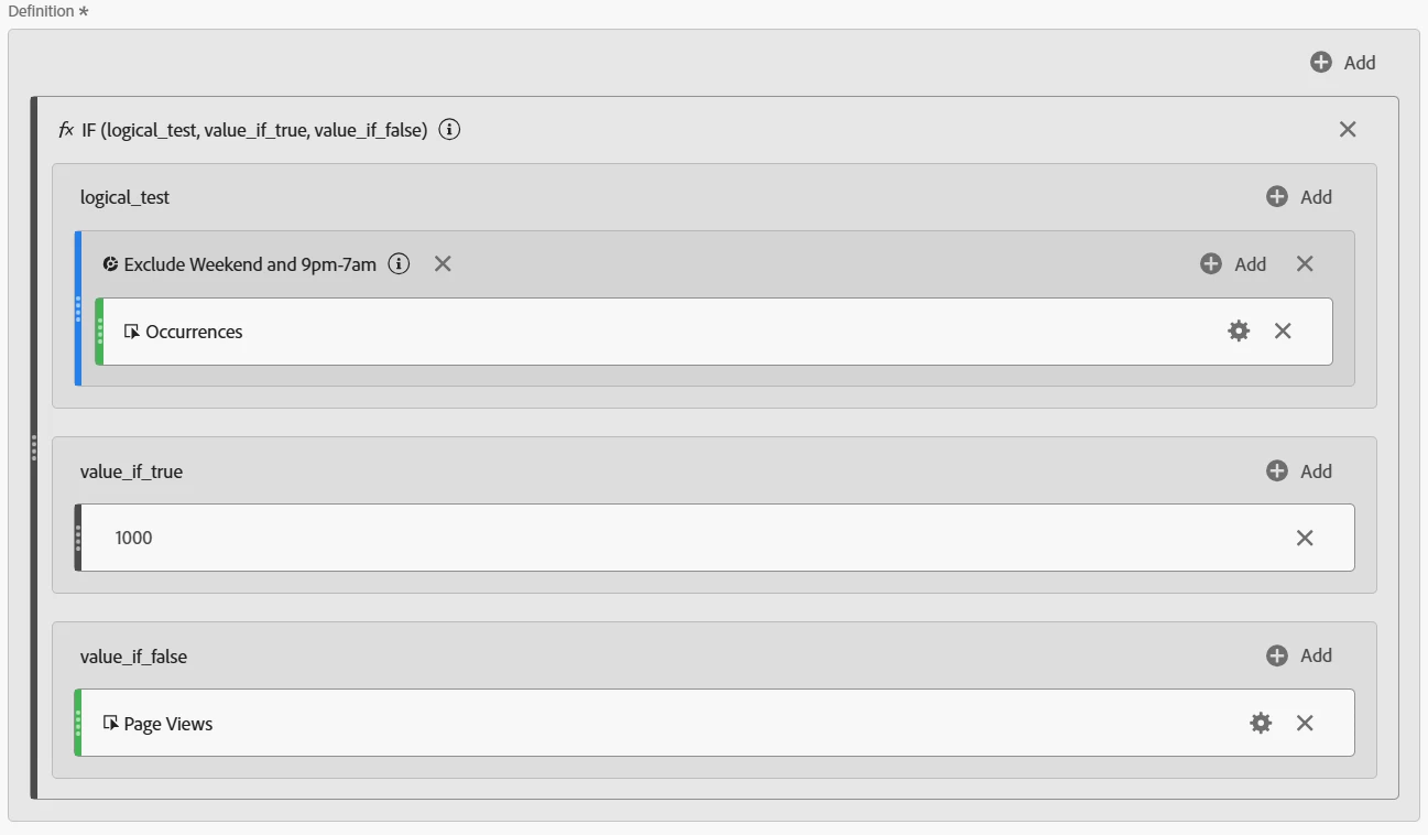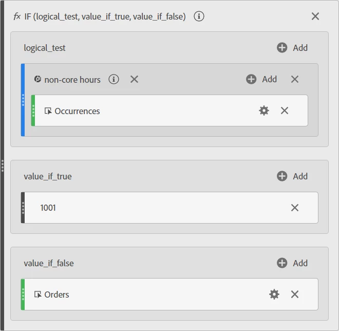 • within 'value_if_false' add the 'Orders' metric (Note: this needs to be the metric you want to alert on during core hours, in this case 'orders')