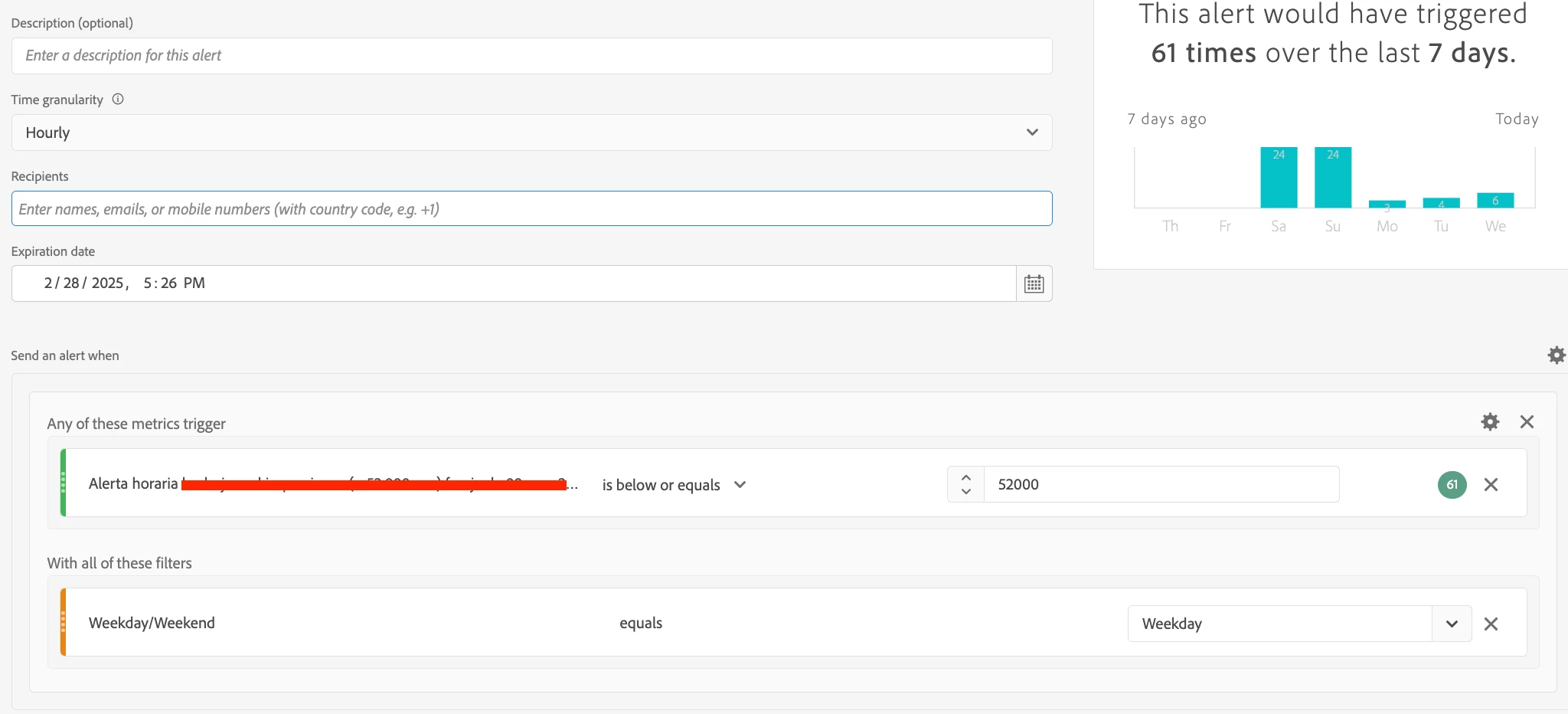 Agregar la dimensión directamente a la Alerta dará como resultado que la lógica busque por encima de 52000 y sea un día laborable (que en un fin de semana fallará el 100% del tiempo, por lo tanto, 24 alertas en esos días)