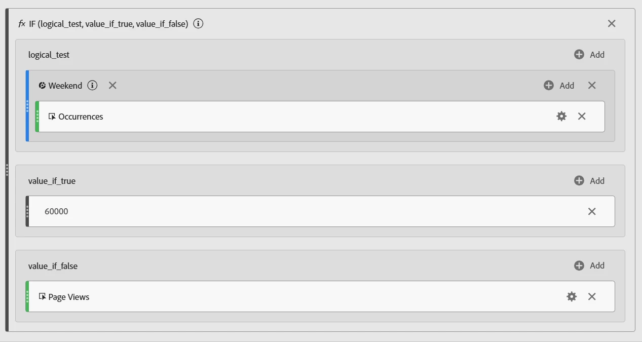 La métrica calculada obliga al tráfico del "fin de semana" a ser un valor estático que no activará la alerta, al tiempo que permite que los días laborables envíen los datos normalmente: